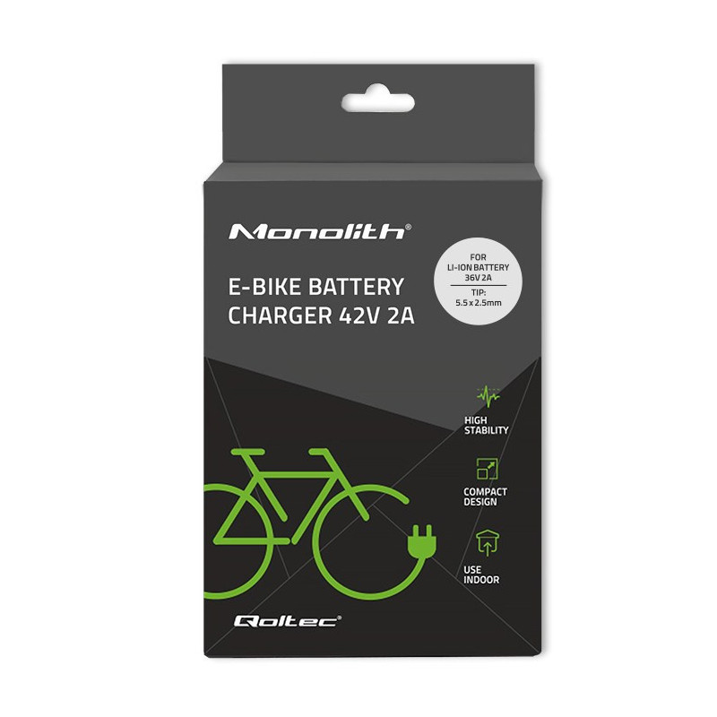 Qoltec 50761 įkroviklis e-dviračių baterijoms su 36V/42V išėjimo įtampa ir 2A įkrovimo srove užtikrina greitą ir efektyvų baterijų įkrovimą.