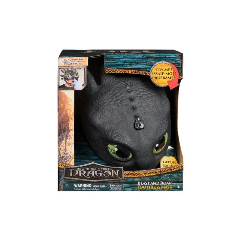 Spin Master - How To Train Your Dragon Blast And Roar Toothless kaukė yra interaktyvi kaukė, leidžianti vaikams vaidinti Toothless personažą, su plazmos sprogimo šviesomis ir garsais. Kaukė turi vandens purkštuvą, imituojantį plazmos sprogimo efektą, ir reikalauja šiek tiek surinkimo.