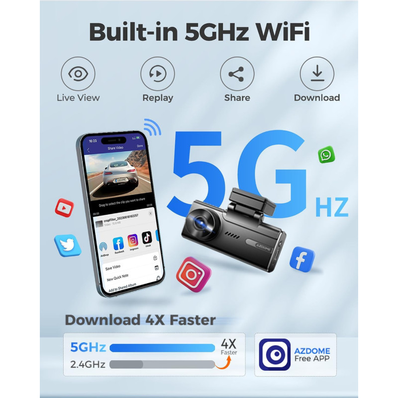 Su 5G/2.4G Wi-Fi palaikymu M580 vaizdo registratorius siūlo greitai atsisiųsti ir dalytis įrašyta filmuota medžiaga. Be to, integruotas GPS modulis leidžia įrašyti tokią informaciją kaip maršrutas ir greitis. Įrenginys taip pat veikia su AZDOME programėle, kuri leidžia patogiai tvarkyti nustatymus, redaguoti įrašus ir dalintis jais su draugais.