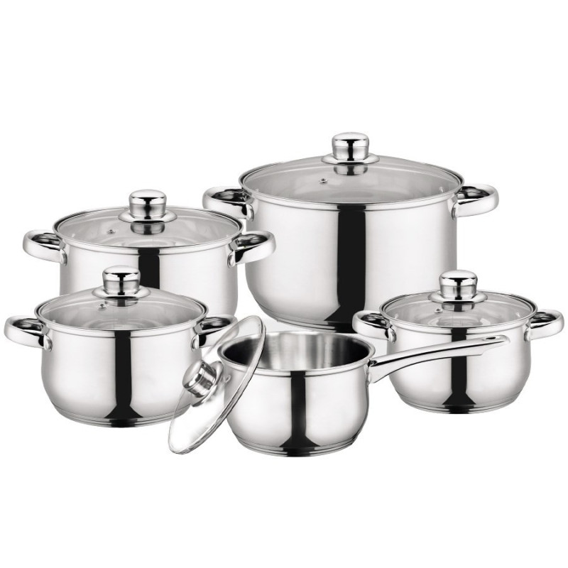 Nerūdijančio plieno indų rinkinys, kuriame yra 18 cm skersmens puodas ir du 22 cm bei 24 cm skersmens keptuvės. Tinkamas įvairiems viryklės tipams, rinkinys turi nuimamą rankeną ir yra saugus plauti indaplovėje.