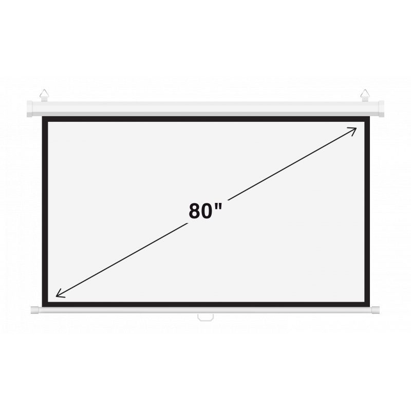 80 colių projekcinė ekranas su 16:9 formatu ir matinio balto paviršiaus danga. Rankinis nuleidimo mechanizmas su automatinio užrakinimo sistema ir 160° matymo kampu.