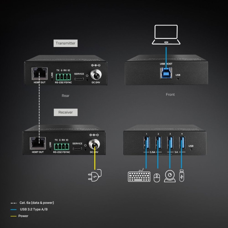 USB 3.2 Gen 1 išplėtiklis palaiko 5Gbps pralaidumą per maksimalų 100 m atstumą naudojant Cat.6A kabelį. Jame yra tokios funkcijos kaip maitinimas per kabelį, RS232 valdymas ir keli USB Type A išėjimai.