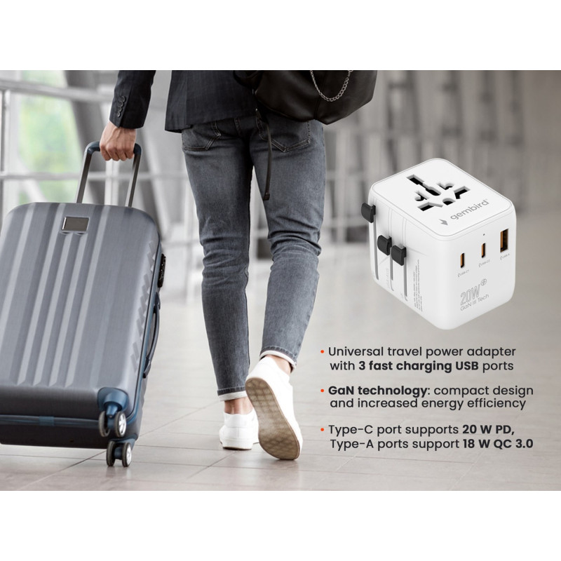 Universalus kelioninis maitinimo adapteris su įvairiais kištukų tipais (Type G, Type I, Type E, Type A) ir dviem USB prievadais (Type-C ir Type-A). Jis palaiko įtampą nuo 100 iki 250 V ir suteikia iki 20 W galingumą USB Type-C įrenginiams.
