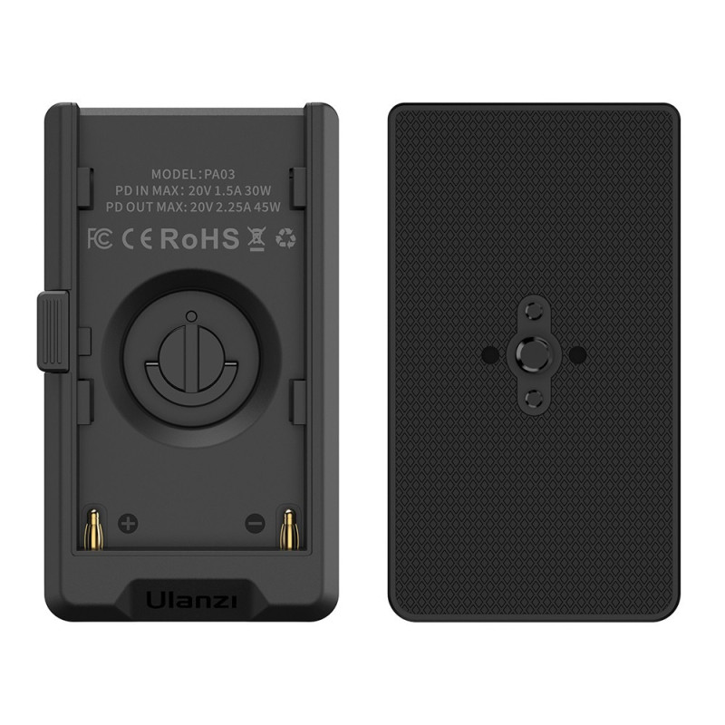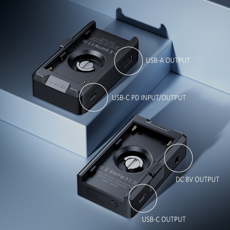Ulanzi PA03 yra universalus maitinimo adapteris, skirtas Sony NP-F serijos baterijoms, turintis kelis išėjimus, įskaitant USB-C, USB-A ir DC 8V. Jis leidžia vienu metu įkrauti ir maitinti įrenginius, todėl tinka įvairiai įrangai, pavyzdžiui, LED šviestuvams ir monitoriams.