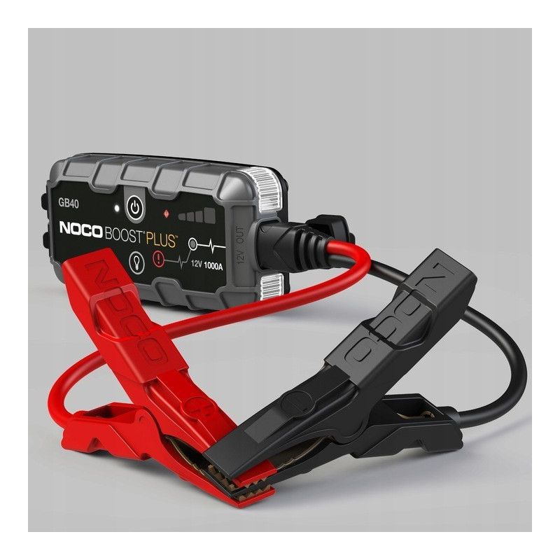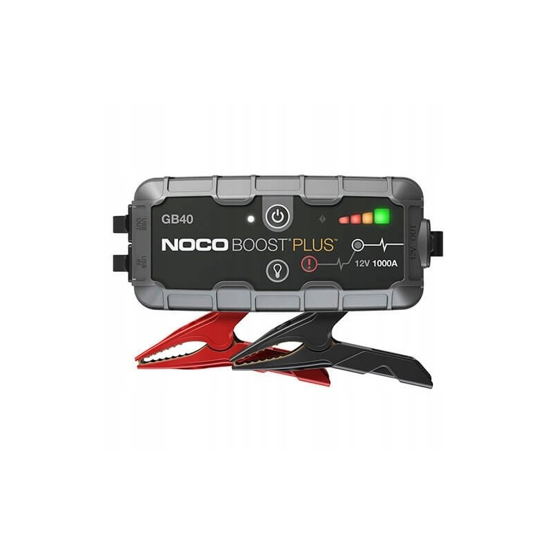 NOCO GB40 Boost yra 12V Akumuliatoriaus Įkroviklis su 1000A pikiniu srove, tinkantis benzininiams varikliams iki 6L ir dyzeliniams varikliams iki 3L. Jame yra integruotas žibintuvėlis, USB energijos banko funkcija, ir jis yra atsparus vandeniui su IP65 klasifikacija.