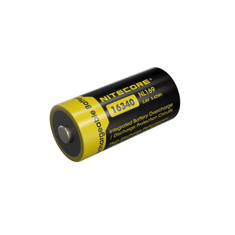 NITECORE NL169 yra 16340 tipo ličio jonų įkraunama baterija, kurios talpa siekia 950 mAh, o įtampa - 3.6V. Jos matmenys yra maždaug 36.3 mm x 16.5 mm, o svoris - 32 g.