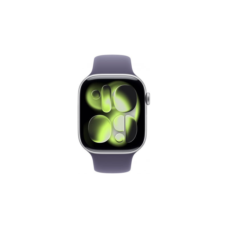„Apple Watch Series 11“ 46 mm sidabro / violetinės spalvos rūko sportinis dirželis – S/M