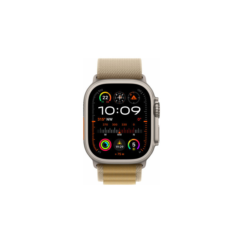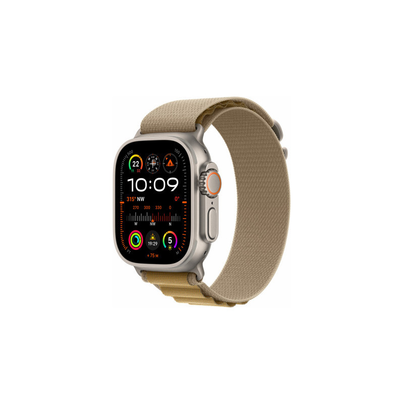 „Apple Watch Ultra 2“ (2024 m.) 49 mm natūralaus titano / gelsvai rudo Alpių stiliaus dirželis – M