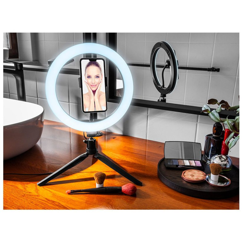 • Rinkinį sudaro 26 cm žiedinis žibintas, trikojis ir nuotolinio valdymo pultas šviesos intensyvumui ir spalvai reguliuoti