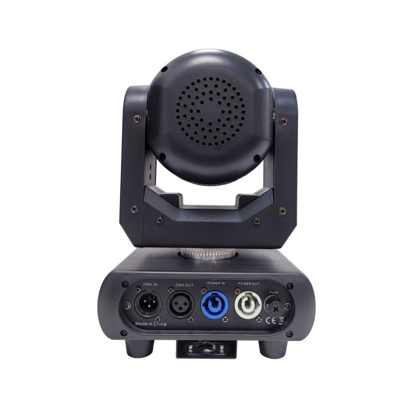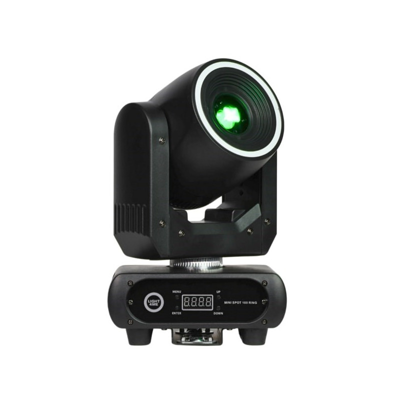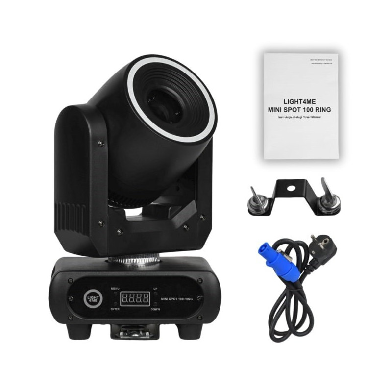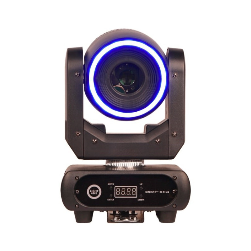 The LIGHT4ME Mini Spot 100 Ring is a compact LED moving head for stage lighting. It has DMX input and output, consumes 150 W of power and includes 25 lighting LEDs that allow you to create a variety of lighting effects.