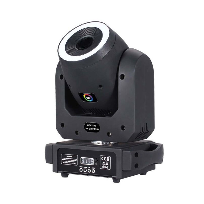 The LIGHT4ME Spot 100 Ring is a black LED spotlight with a power of 150 W and 13 lighting LEDs. It has DMX input and output for easy control and weighs 4.5 kg.