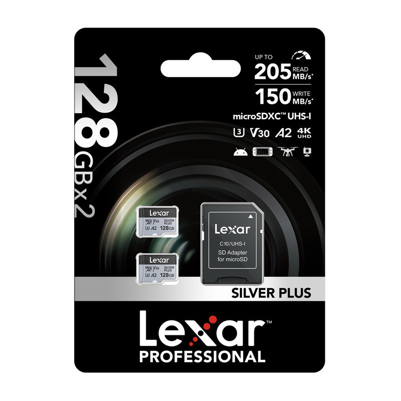Set of 2 Lexar High-Performance Silver Plus microSDXC 2x128GB memory cards + adapter