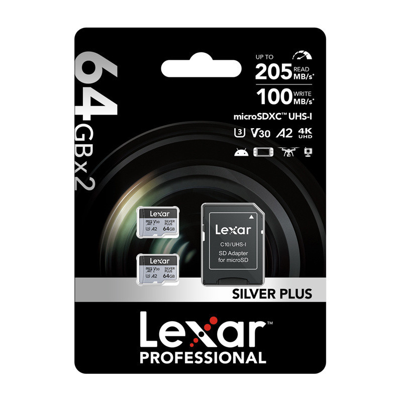 Set of 2 Lexar High-Performance Silver Plus microSDXC 2x64GB memory cards + adapter