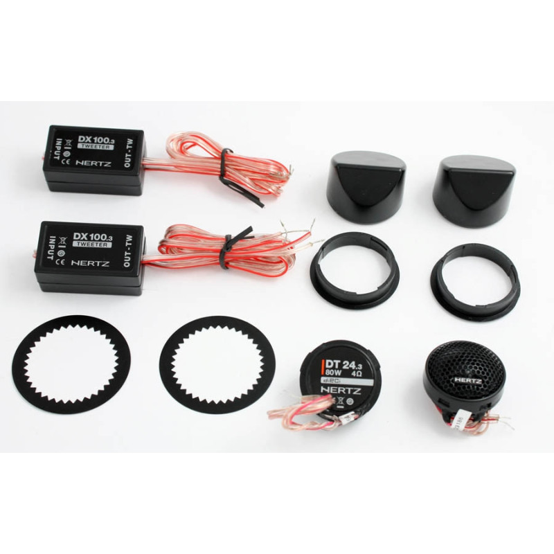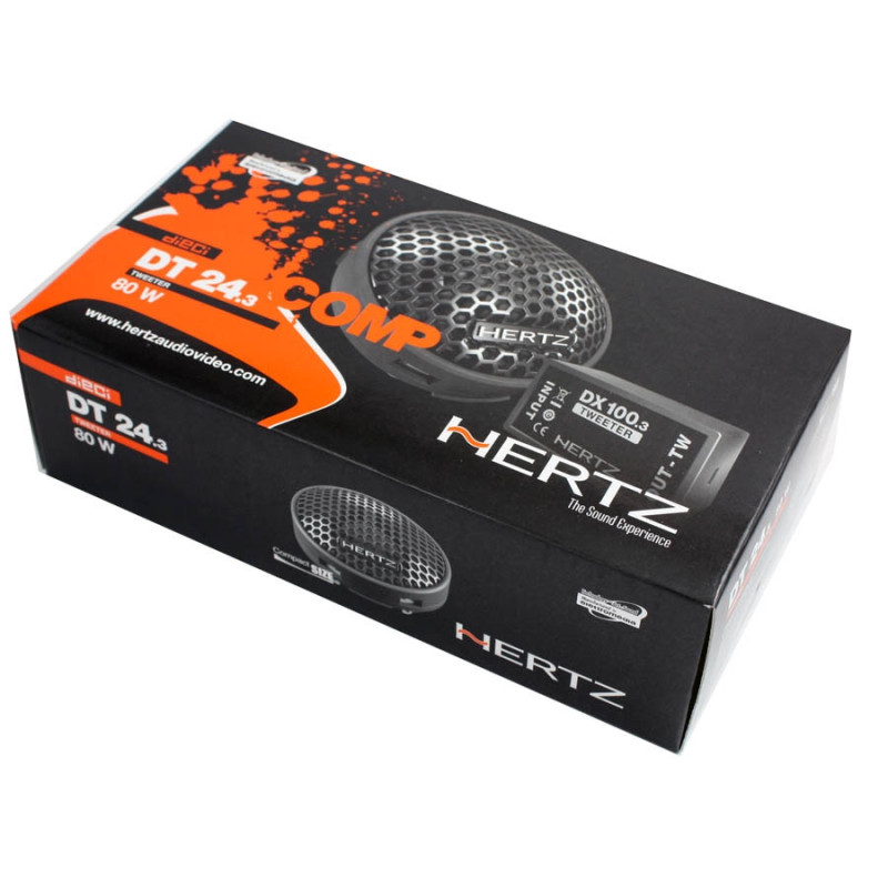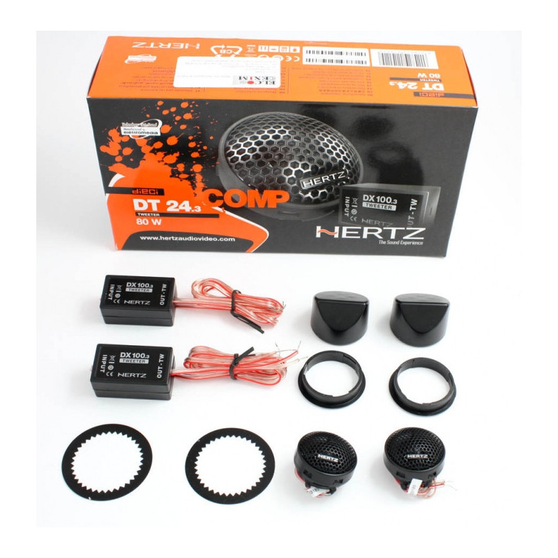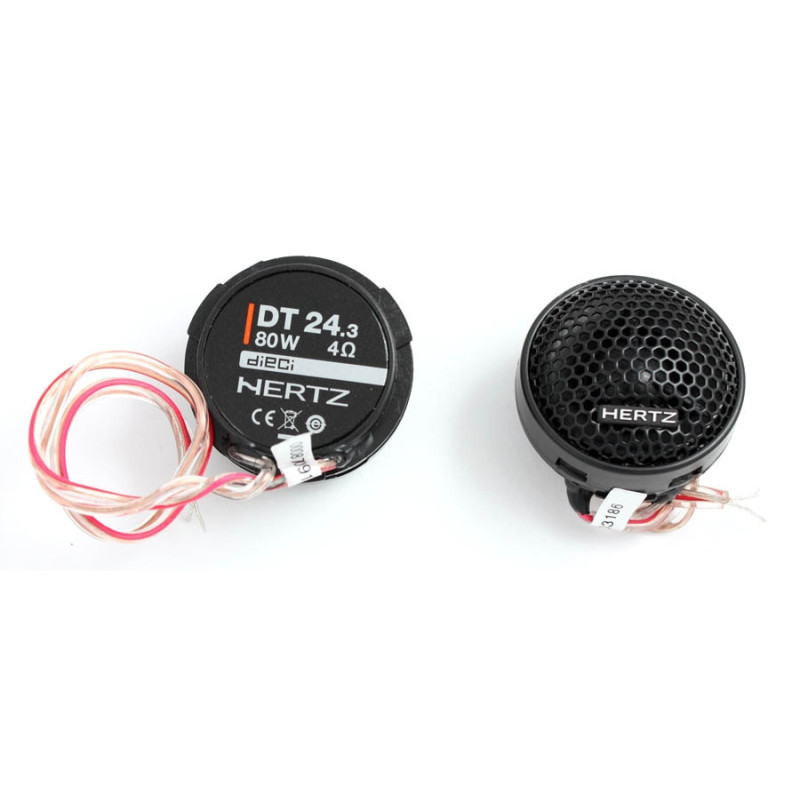 Hertz DT 243 aukštų dažnių garsiakalbiai„Hertz DT 243“ aukštų dažnių garsiakalbiai iš „DiECi“ serijos tiekia 80 W galią ir platų dažnių atsaką – nuo 3000 Hz iki 23000 Hz. Jie pasižymi itin aktyviu žiediniu akustiniu lęšiu ir neodimio magnetu, fiksuojančiu subtilias garso detales. Jų jautrumas yra 94 dB. Pridedami laikikliai išoriniam ir įleidžiamajam montavimui. Garsiakalbiai taip pat turi tvirtą, bet lengvą, aukštai temperatūrai atsparią PEI diafragmą, kuri puikiai fiksuoja kiekvieną garsą ir užtikrina išskirtinai sodrų garsą.