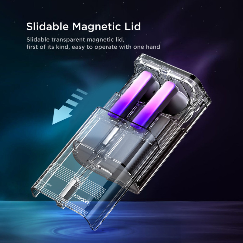 Novatoriškas permatomas korpusas ir stumdomas „Joyroom JR-TC1“ ausinių dizainas suteikia ne tik unikalią išvaizdą, bet ir precedento neturintį naudojimo patogumą. Dėl šio sprendimo ausines galite lengvai valdyti viena ranka, o tai ypač naudinga keliaujant, sporto salėje ar vaikštant.