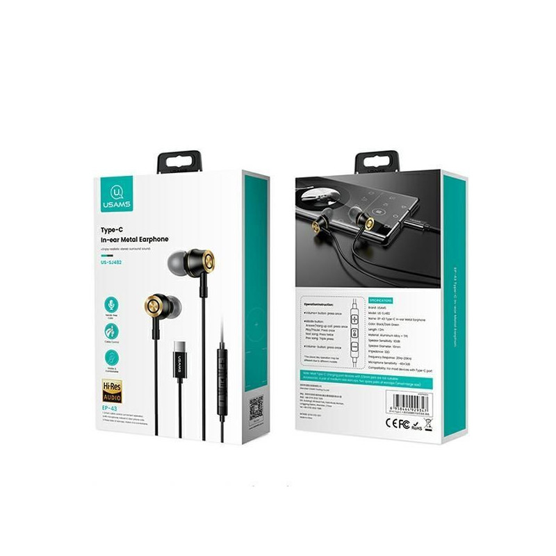 USAMS EP-43 ausinės aliuminio korpuse. Ergonomiškas dizainas užtikrina patogų ir malonų dėvėjimą. Integruotas nuotolinio valdymo pultas su mikrofonu leidžia lengvai valdyti ausines nenaudojant telefono. Dizainerio dizainas džiugina unikalia ausinių išvaizda.