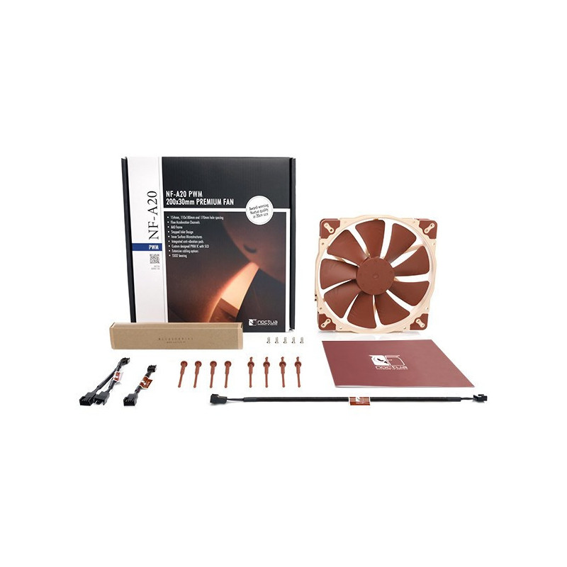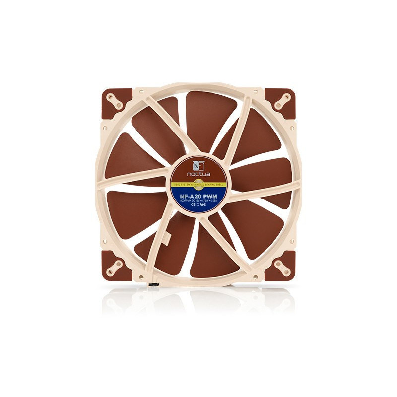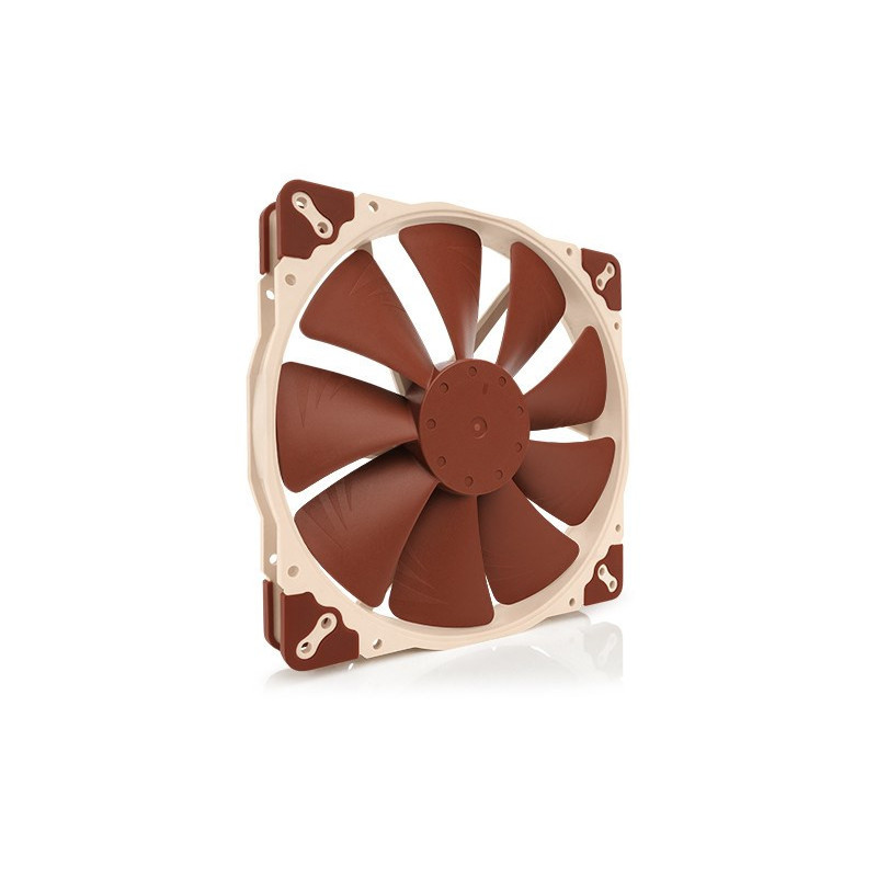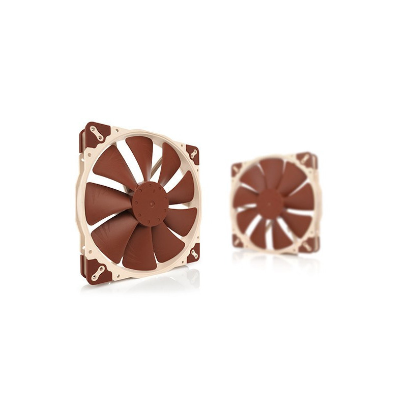 Noctua NF-A20 PWM - aukštos kokybės 20 cm ventiliatorius kompiuterio korpusams, pasižymintis rudos-kreminės spalvų schema.