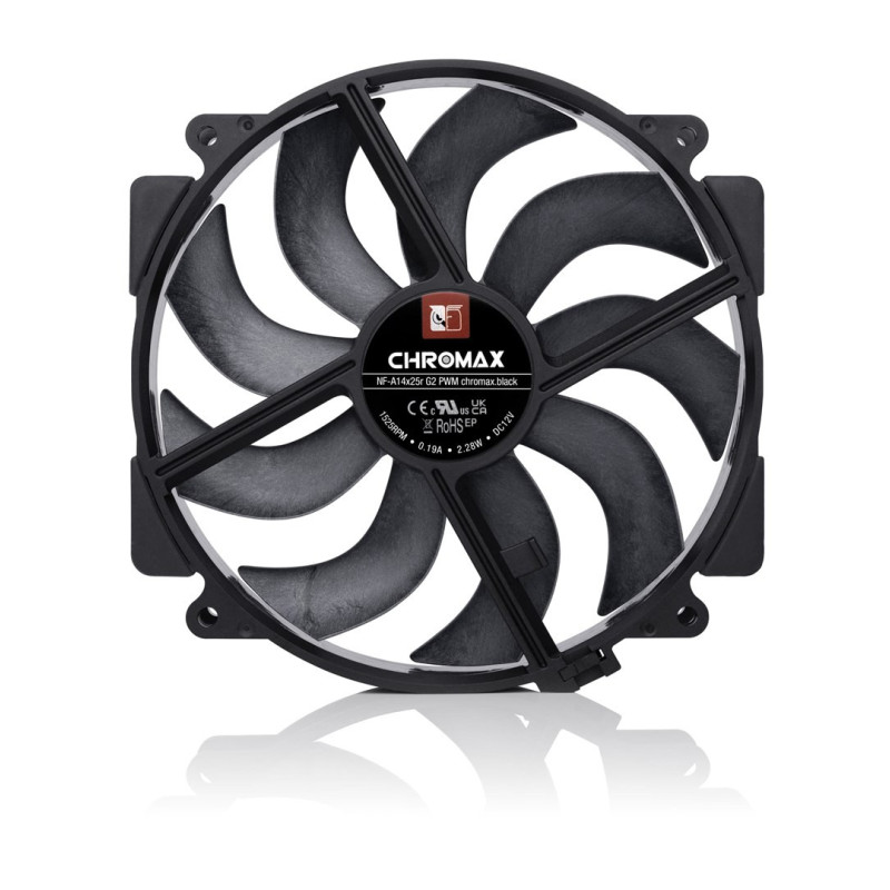 NF-A14x25r G2 PWM chromax.black yra 140 mm kompiuterio korpuso ventiliatorius, užtikrinantis efektyvų oro srautą, maksimalus sukimosi greitis siekia 1500 RPM. Jame įrengtas savistabilizuojantis alyvos slėgio guolis, užtikrinantis ilgaamžiškumą, o triukšmo lygis esant mažam greičiui yra tik 19,7 dB.