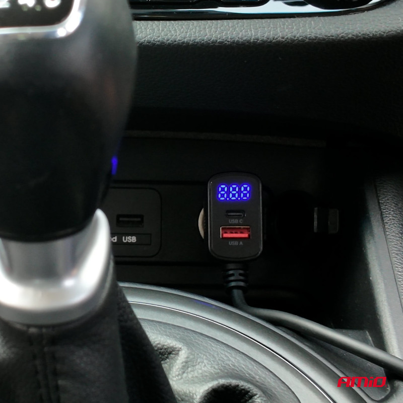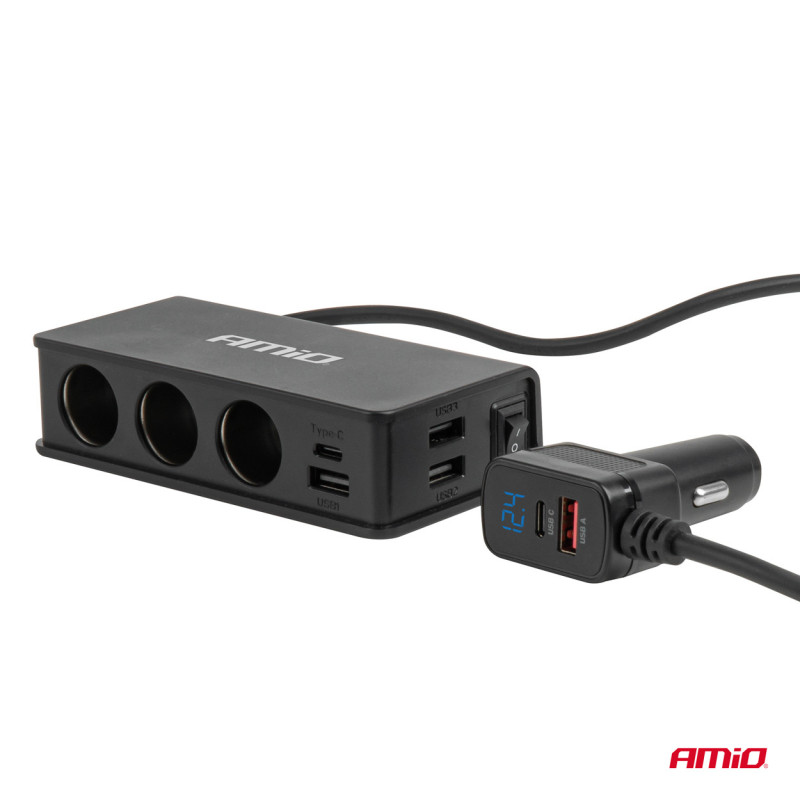 Cigarečių žiebtuvėlio lizdo skirstytuvas su įkrovikliu 3xUSB-A USB-C QC 3.0 PD 3.0. 148W AMIO-04836