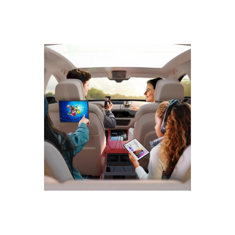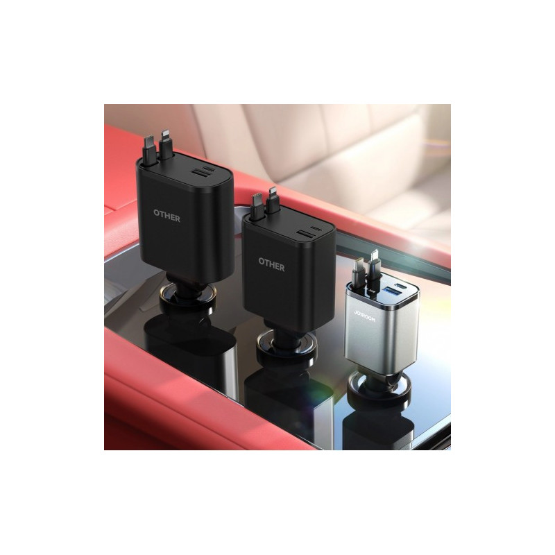 The Joyroom JR-CCL05 is a compact 4-in-1 car charger that provides fast and convenient charging for up to four devices simultaneously. Equipped with two built-in, retractable 80cm cables (USB-C and Lightning) and additional USB-C and USB-A ports, it's perfect for family trips. It supports fast charging up to 30W (PD/PPS) and is 57% smaller than standard retractable chargers. Thanks to its 180° swivel design and automatic cable rewind in 1 second, you can keep your car tidy. The aluminum housing and fire-resistant materials ensure safe use in all conditions.
