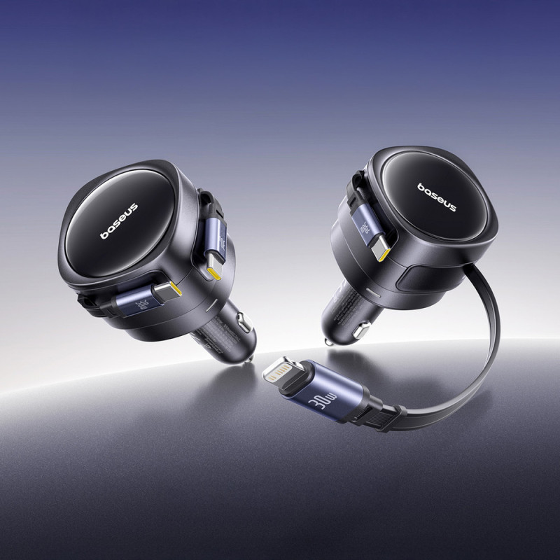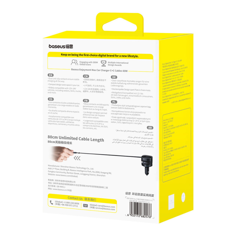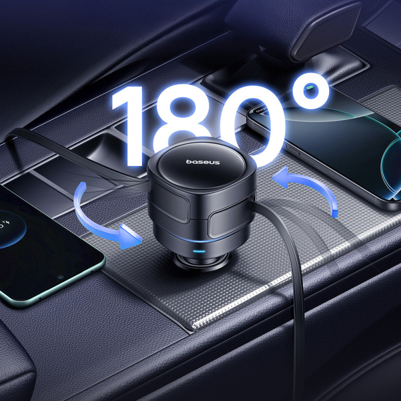 The Baseus Enjoyment Max 60W is a functional car charger equipped with two retractable USB-C cables that allow you to conveniently charge two devices simultaneously. The 180° rotatable design makes it easy to fit into your car's interior, and the retractable mechanism helps keep cables tidy and tangle-free. A combined power output of up to 60W ensures fast and stable power, while the wide 12-24V input range allows for use in a variety of vehicles. It's a practical solution for everyday driving and longer trips.