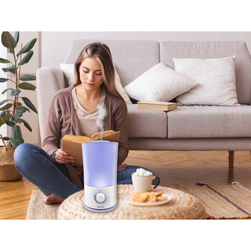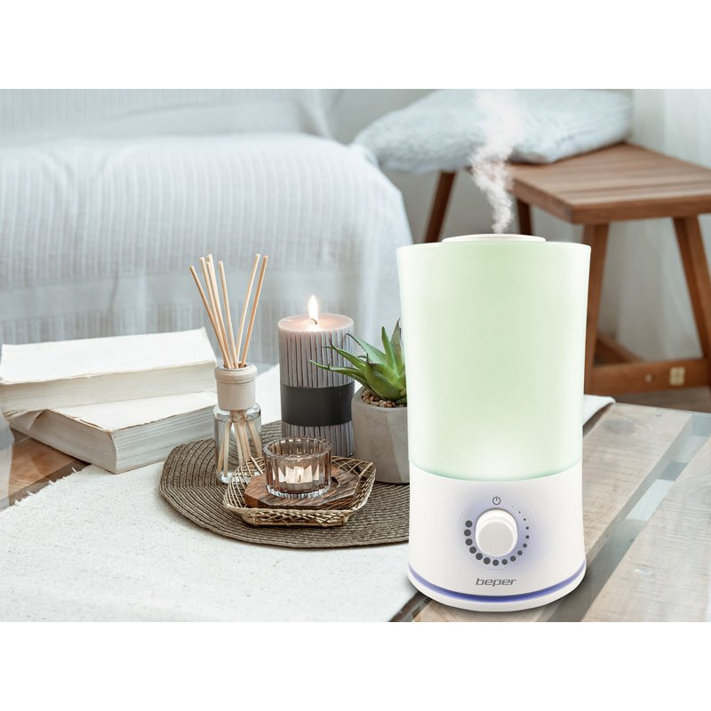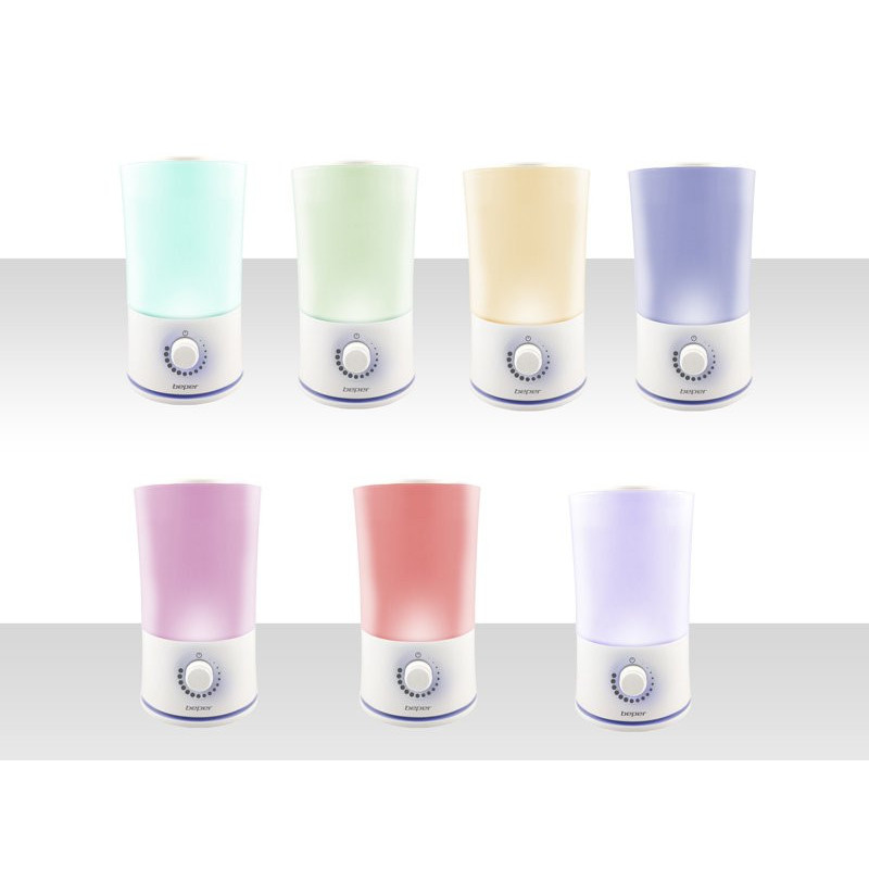 Klasikinės formos drėkintuvas ir aromaterapinis difuzorius su ultragarsiniu purkštuvu ir 7 spalvų LED lemputėmis, nuolat keičiančiomis chromatines spalvas. Su rankenėle šalto rūko išėjimo lygiui reguliuoti. ĮJUNGIMO ir IŠJUNGIMO jungiklis gale. Automatinis išsijungimas pasibaigus vandeniui. Rūko išėjimo lygis 180 ml/val. 2,4 l vandens bakas.