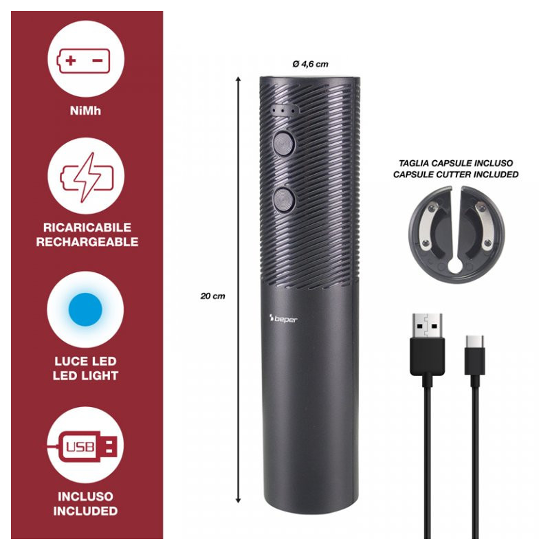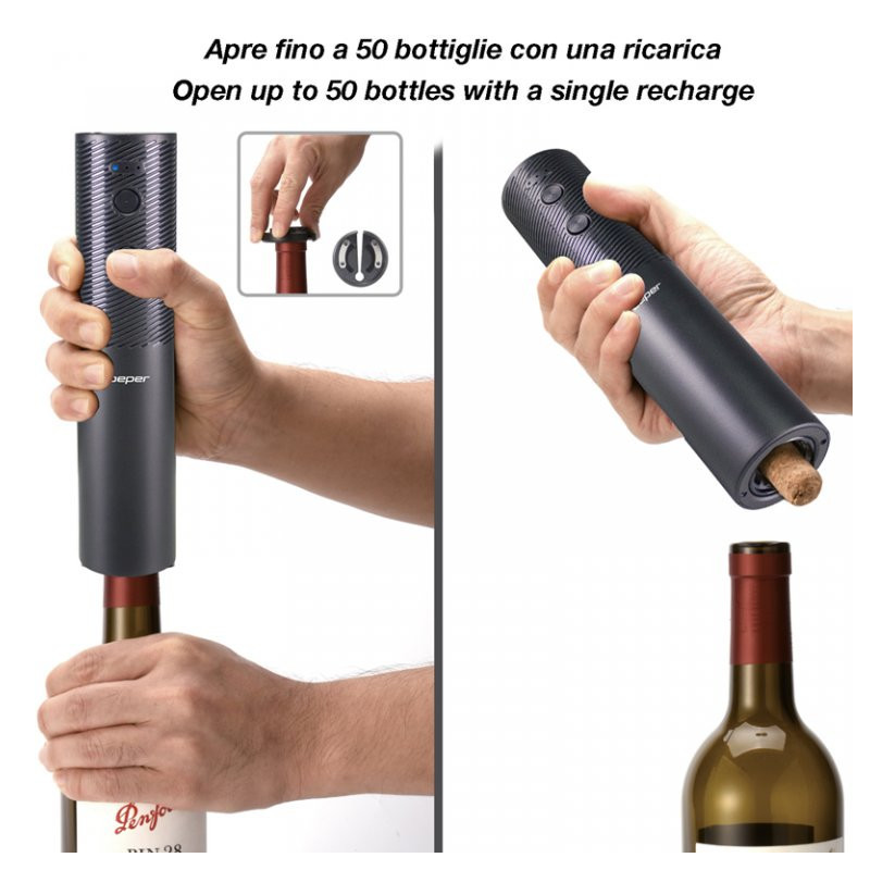 Įkraunamas kamščiatraukis su USB laidu leidžia lengvai ir greitai atidaryti iki 30 butelių vienu įkrovimu.