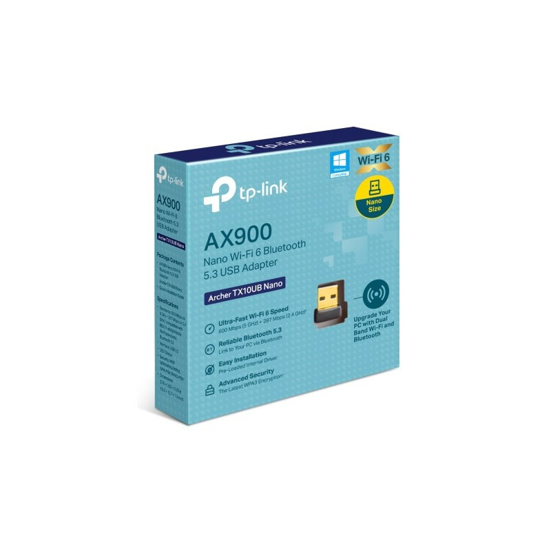 TP-Link Archer TX10UB Nano tinklo adapteris palaiko dviejų juostų Wi-Fi, užtikrindamas maksimalų duomenų perdavimo greitį iki 600 Mbit/s 5 GHz ir 287 Mbit/s 2.4 GHz. Suderinamas su Windows 10 ir 11, jis turi Bluetooth 5.3 ir jungiasi per USB 2.0.