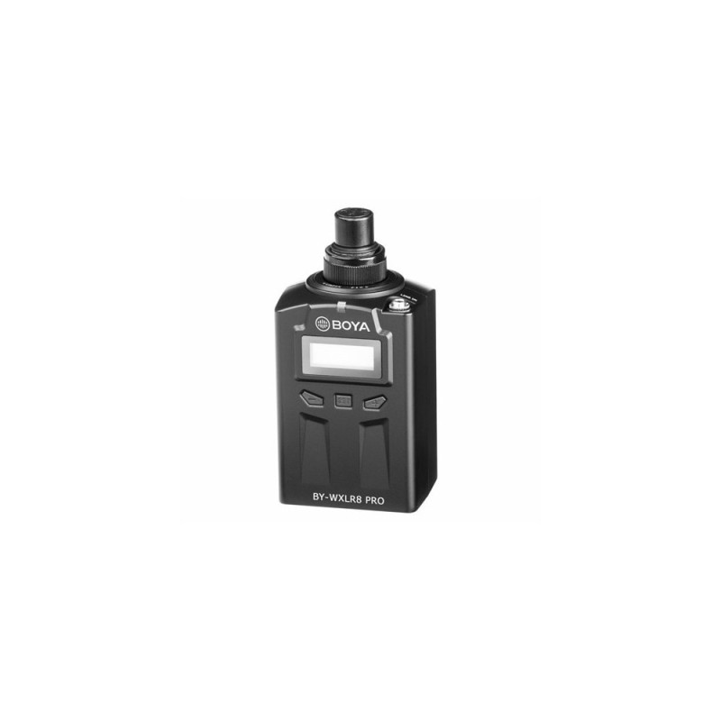 BOYA BY-WXLR8 PRO plug-in microphone transmitter. Compatible with BOYA RX8 Pro and SP-RX8 Pro receivers. The transmitter has an automatic lock that will ensure that the transmitter settings are not accidentally changed during operation. The transmitter also has a lockable 3.5mm TRS input connector. The microphone transmitter operates on two AA batteries.