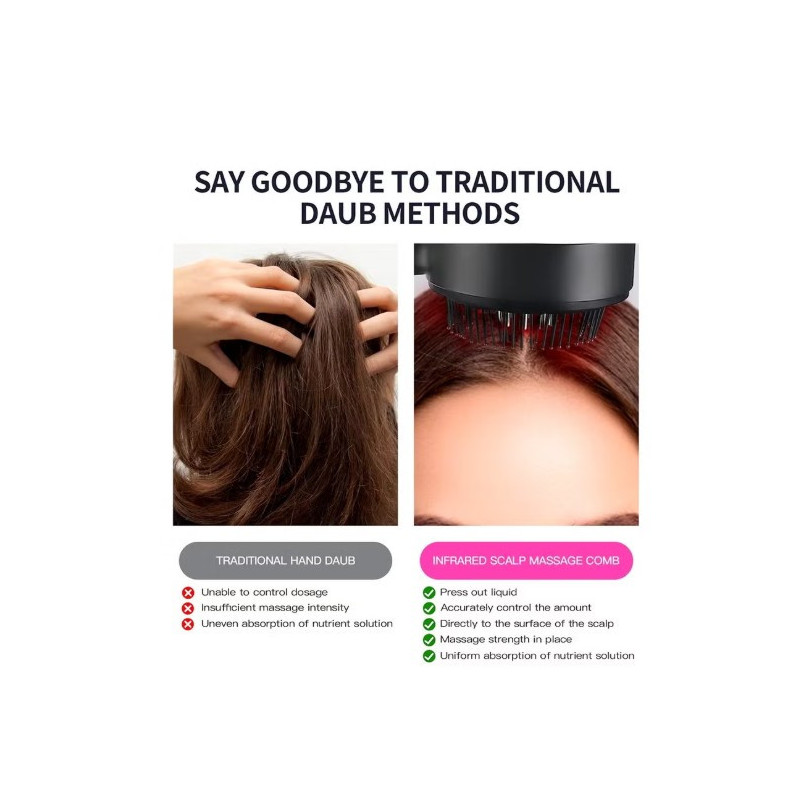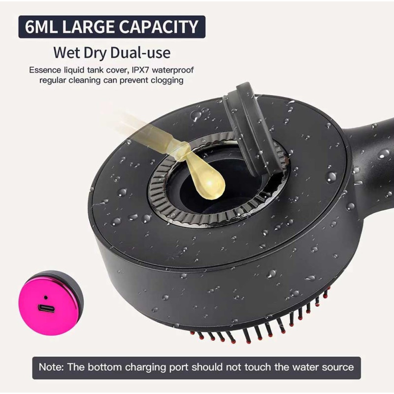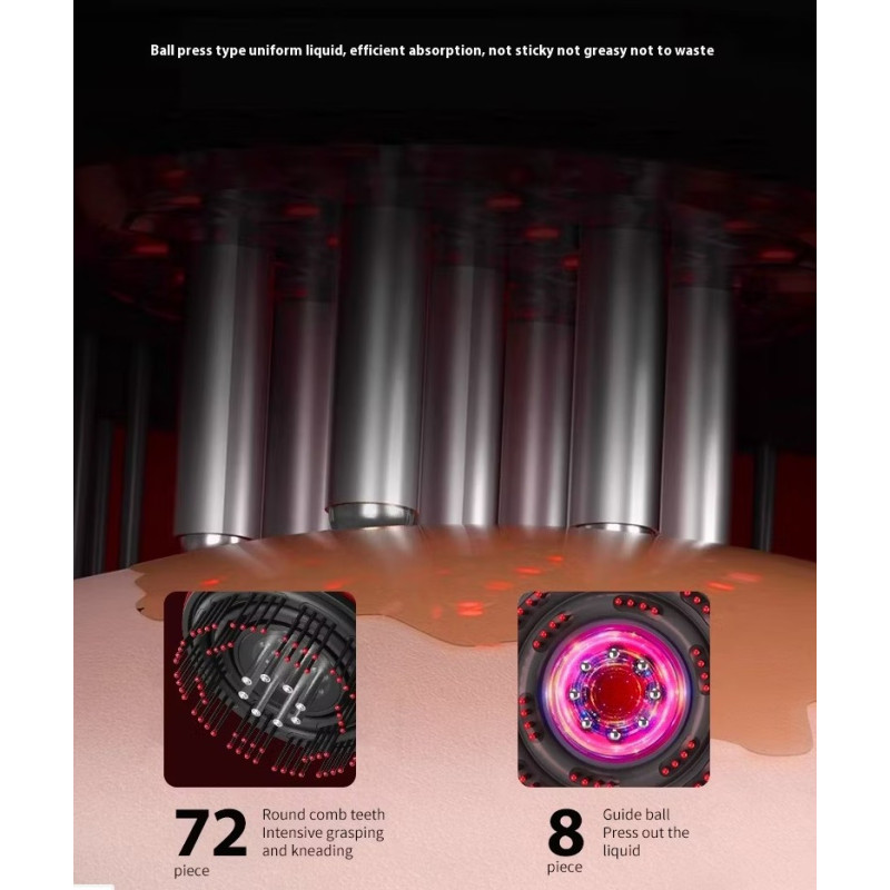 Plaukų aliejaus aplikatorius: Plaukų aliejaus aplikatorius su galvos odos masažuokliu turi 6 ml serumo kamerą ir 72 apvalių dantų šukas, taip pat 8 skysčio nukreipimo rutulinius rutuliukus, skirtus tolygiam eterinių aliejų paskirstymui. Jis masažuoja galvos odą, tuo pačiu tiekdamas maistines medžiagas tiesiai į plaukų šaknis, kad būtų veiksminga priežiūra.