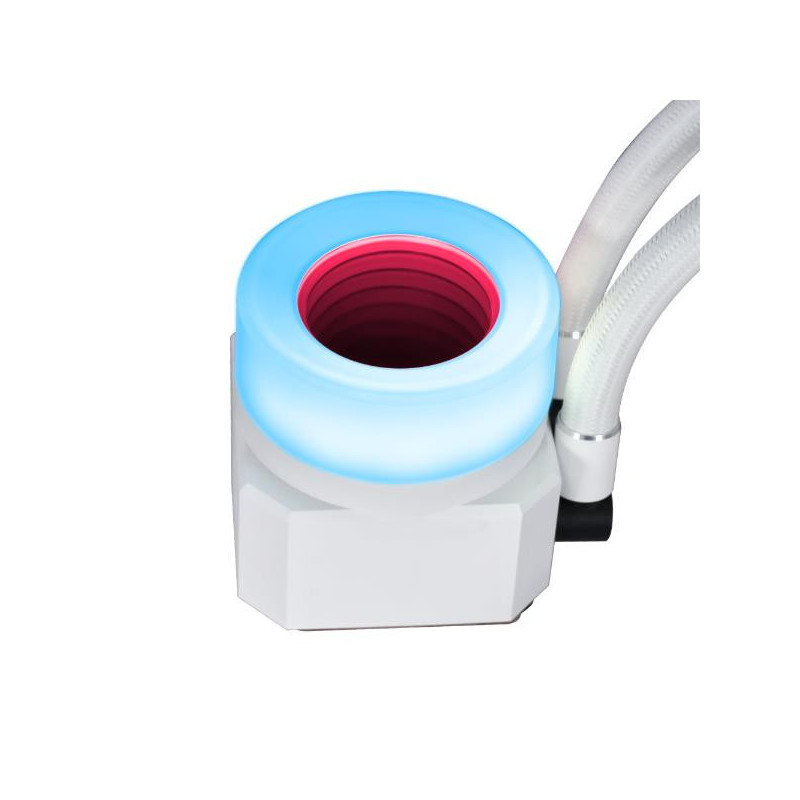 The Galahad II Trinity series' pump cap has three interchangeable designs, each with a unique look and two rings of colors that can be individually controlled with different lighting effects.