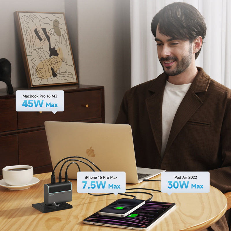 Du USB-C ir vienas USB-A prievadas leidžia vienu metu įkrauti tris įrenginius, todėl nereikia kelių įkroviklių.