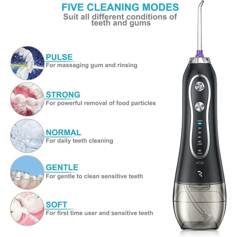 Komplekte yra 5 antgaliai, skirti valyti tarpdančius ir burnos ertmę