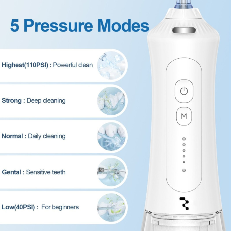 5 pritaikomi slėgio režimai: Nuo švelnaus masažo jautrioms dantenoms iki gilaus valymo (nuo 20 iki 110 PSI). Kiekvienas ras sau tinkamą intensyvumą.