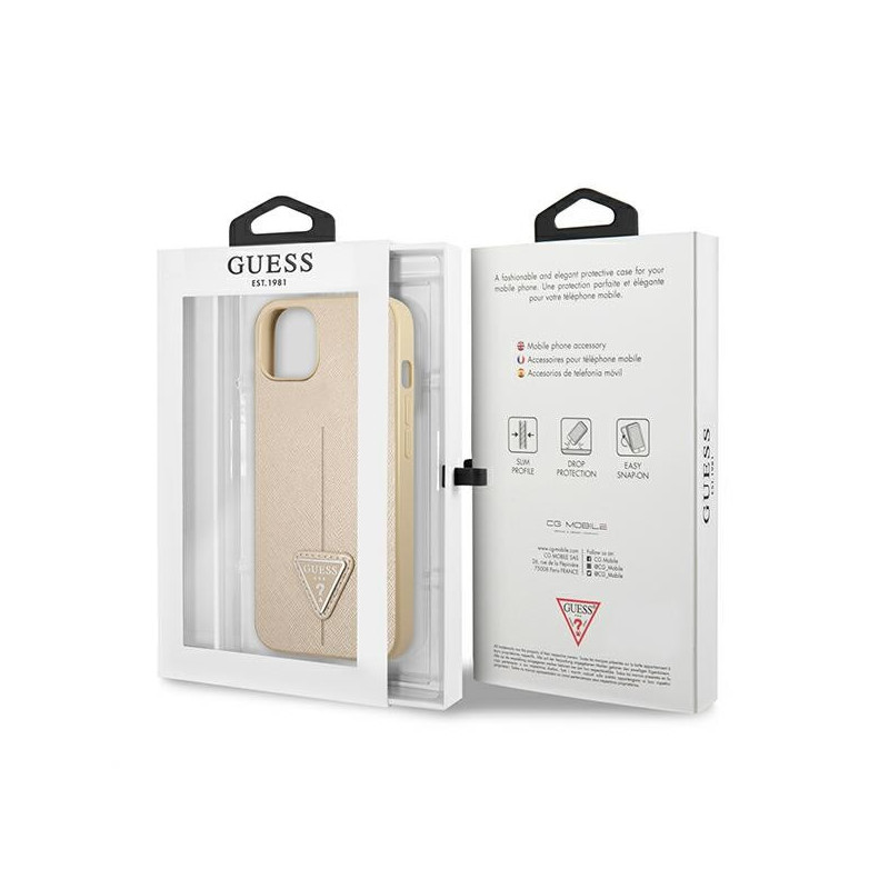 Guess GUHCP13SPSATLE iPhone 13 mini 5,4 'smėlio spalvos / smėlio spalvos kietas SaffianoTriangle logotipas