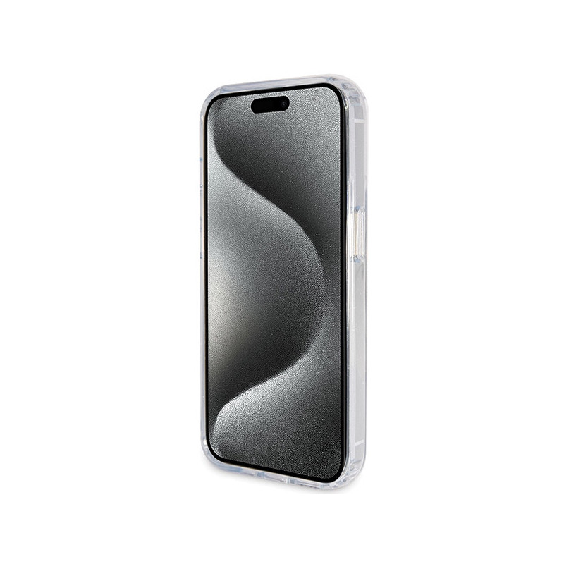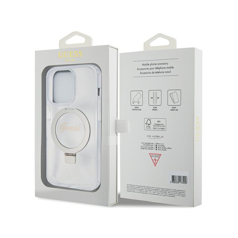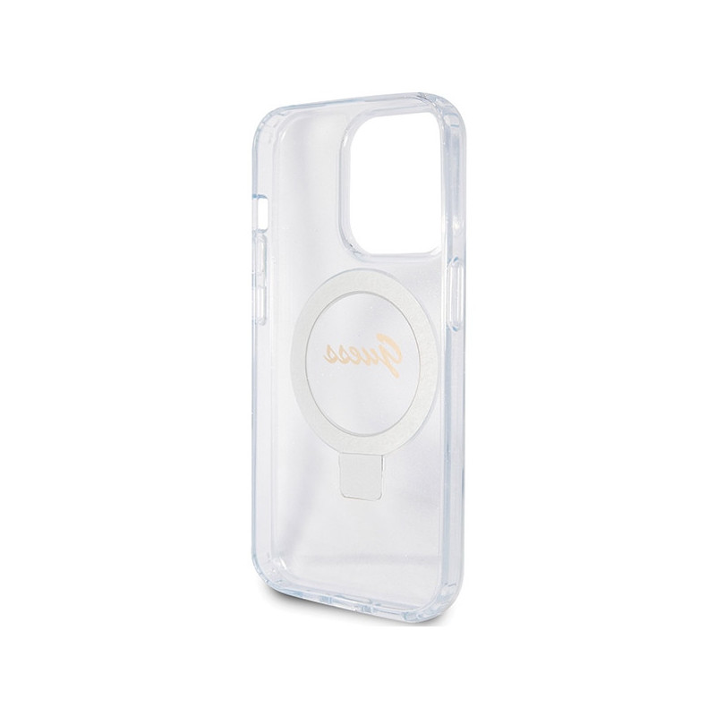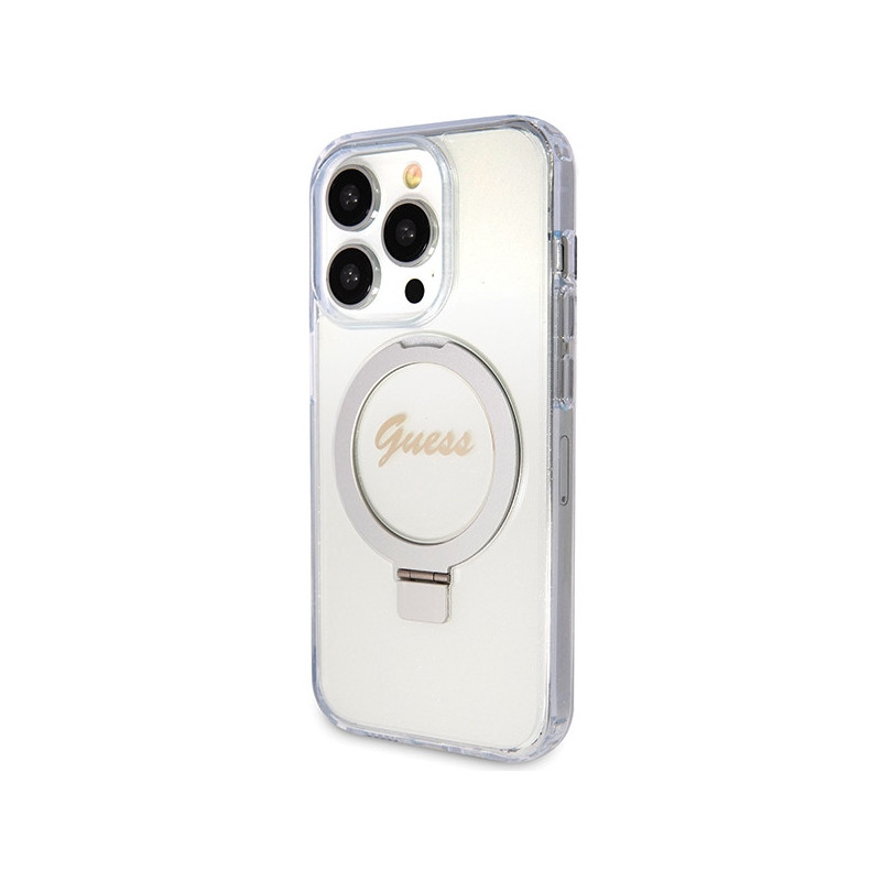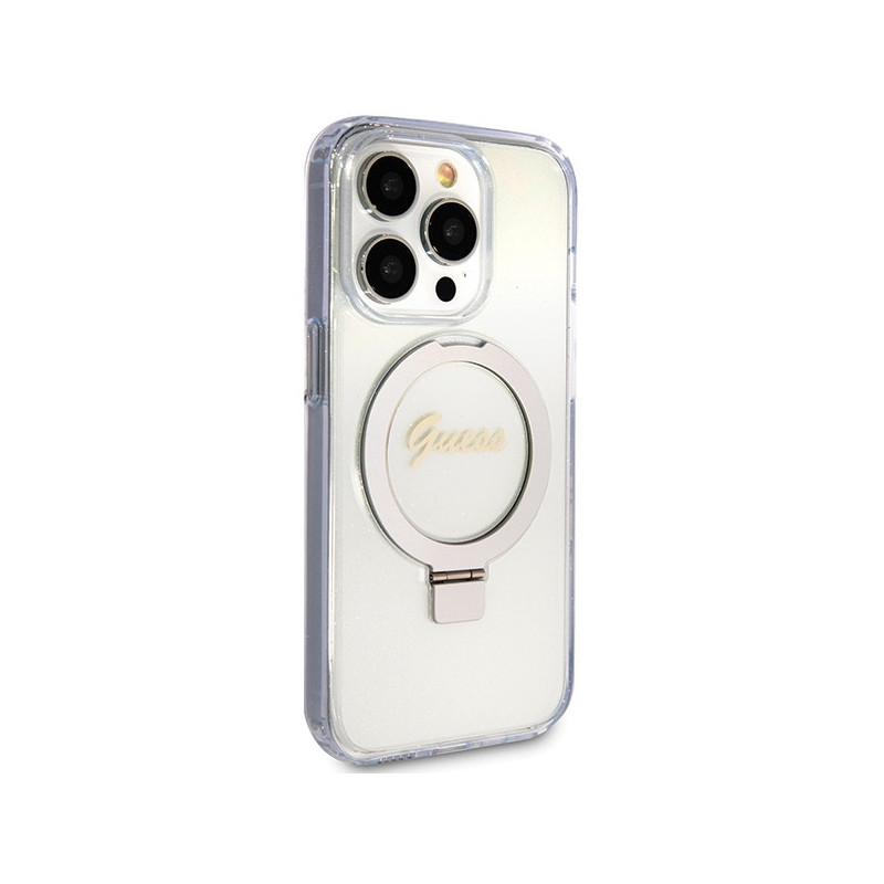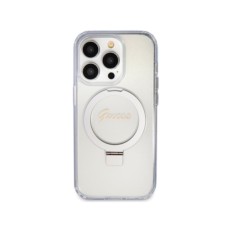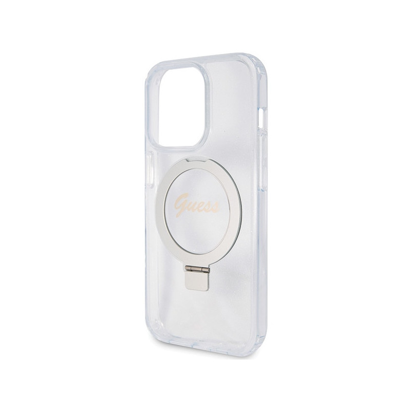 Guess Ring Stand Script Glitter MagSafe dėklas iPhone 15 Pro - skaidrus