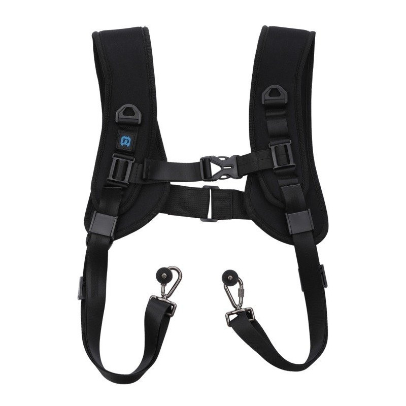 Dvigubas petinis diržas leidžia fotografams vienu metu nešti dvi kameras, suteikdamas lengvą prieigą prie kiekvienos. Pagamintas iš patvaraus nailono su patogiu putų paminkštinimu, jis tolygiai paskirsto svorį, kad sumažintų įtampą ilgesnio naudojimo metu.