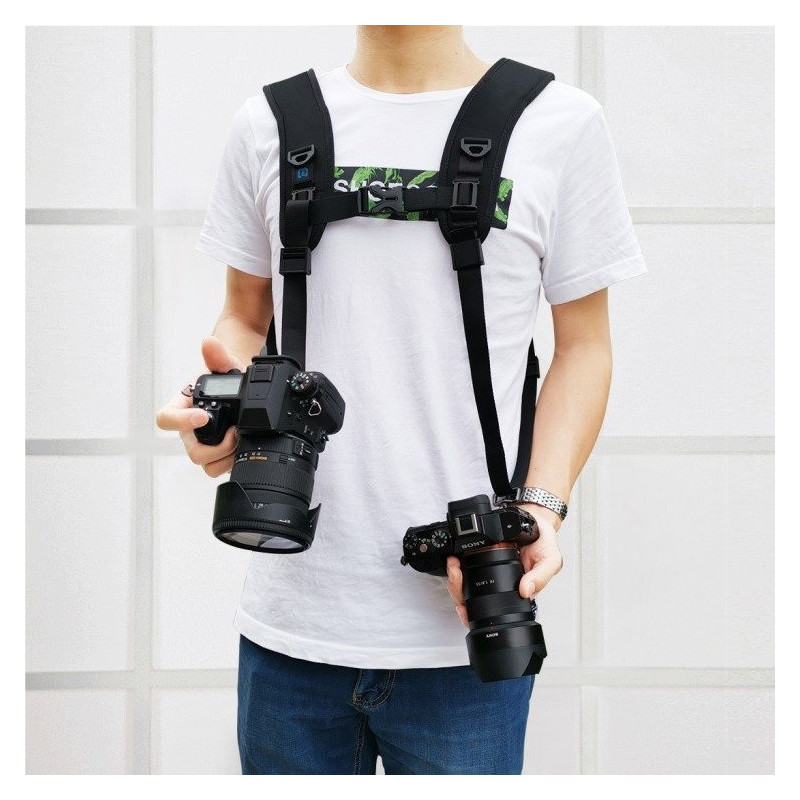 Dvigubas petinis diržas leidžia fotografams vienu metu nešti dvi kameras, užtikrindamas patogų prieinamumą prie kiekvienos. Pagamintas iš tvirto nailono su patogia putų paminkštinimu, jis tolygiai paskirsto svorį, sumažindamas nuovargį ilgai naudojant.