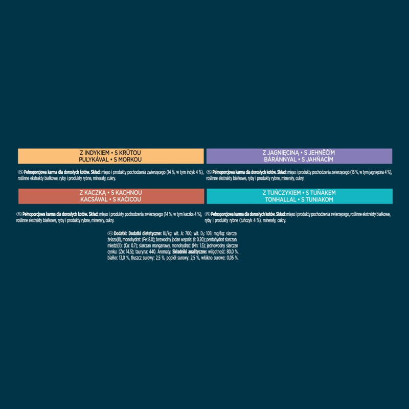 Drėgnas kačių maistas keturiais skaniais skoniais: Tunas, Antiena, Aviena ir Kalakutas. Kiekviena 85g porciją yra maistingas patiekalas jūsų katės draugui.