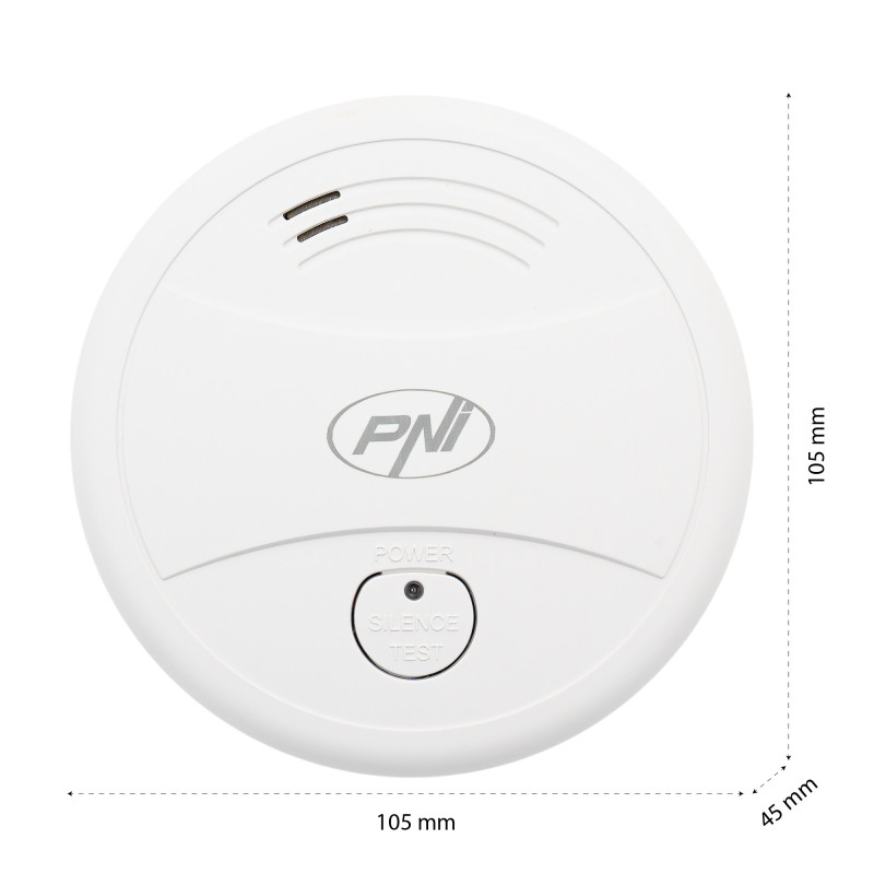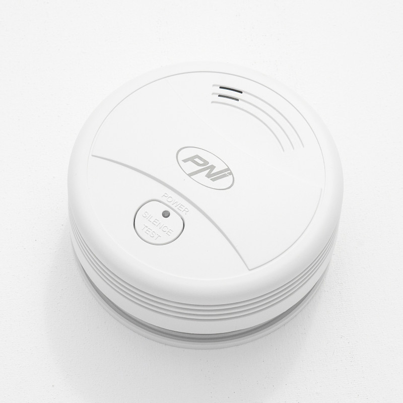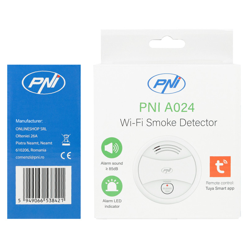 Dūmų jutiklis PNI A024 su „Wi-Fi“, valdymas iš „Tuya Smart“ programos, maitinimas iš 9 V baterijos, 85 dB, garsinis ir vaizdinis signalas, tylus signalas