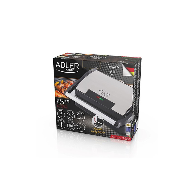 Adler AD 3052 yra kompaktiškas elektrinis grilis, skirtas patalpų naudojimui. Jo stačiakampio formos korpusas su nelipnia danga užtikrina lengvą maisto išėmimą ir valymą, o užrakinta konstrukcija suteikia papildomą saugumą.