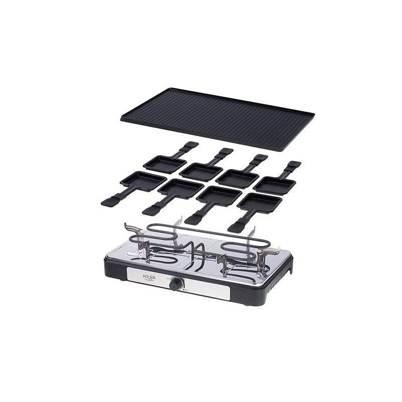 ADLER AD 6616 elektrinė grilis turi dvipusę kepimo paviršių su nelipnia danga ir reguliuojamą termostatą temperatūros kontrolei. Jo bendra galia siekia 1400 W, o komplekte yra 8 mediniai mentelės ir 8 mini keptuvėlės su nešylančiomis rankenomis.