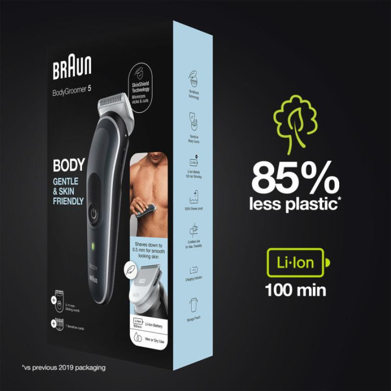 Braun BG5350 BodyGroomer Series 5 yra skirtas kūno priežiūrai, tinkantis naudoti tiek drėgnomis, tiek sausomis sąlygomis. Jame yra įkraunama ličio jonų baterija, kuri veikia iki 100 minučių, ir du šukų priedai skirtingiems plaukų ilgiams.