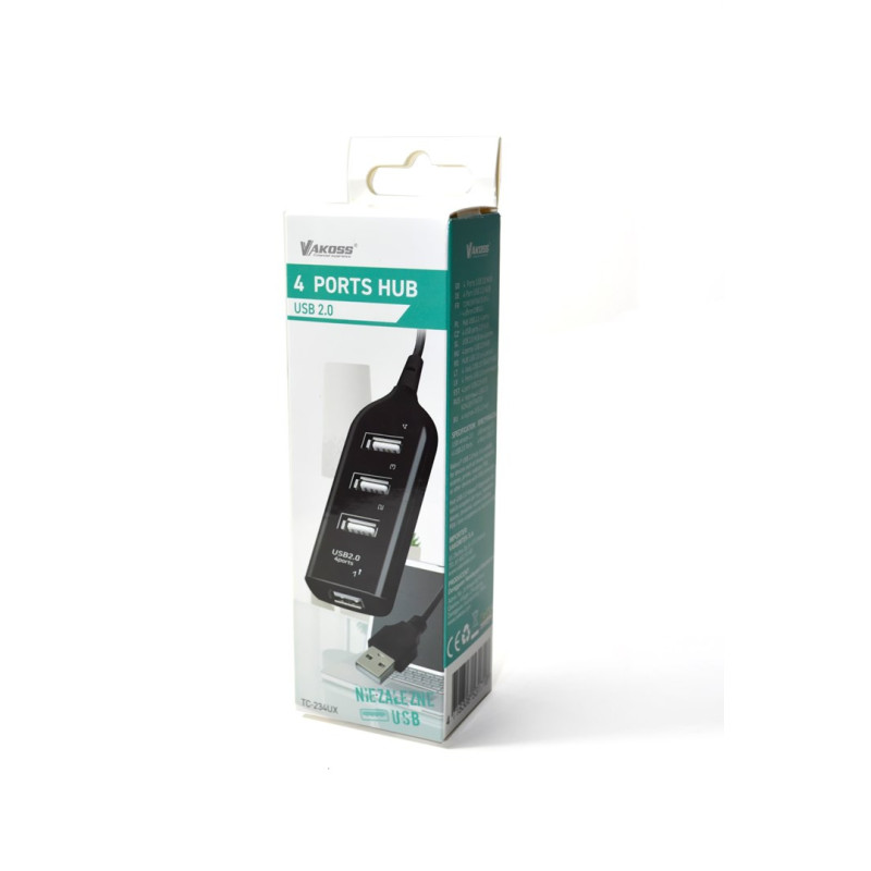 Vakoss TC-234UX USB 2.0 hub with 4 ports and 5 V DC power supply, ensuring reliable and fast device connection.