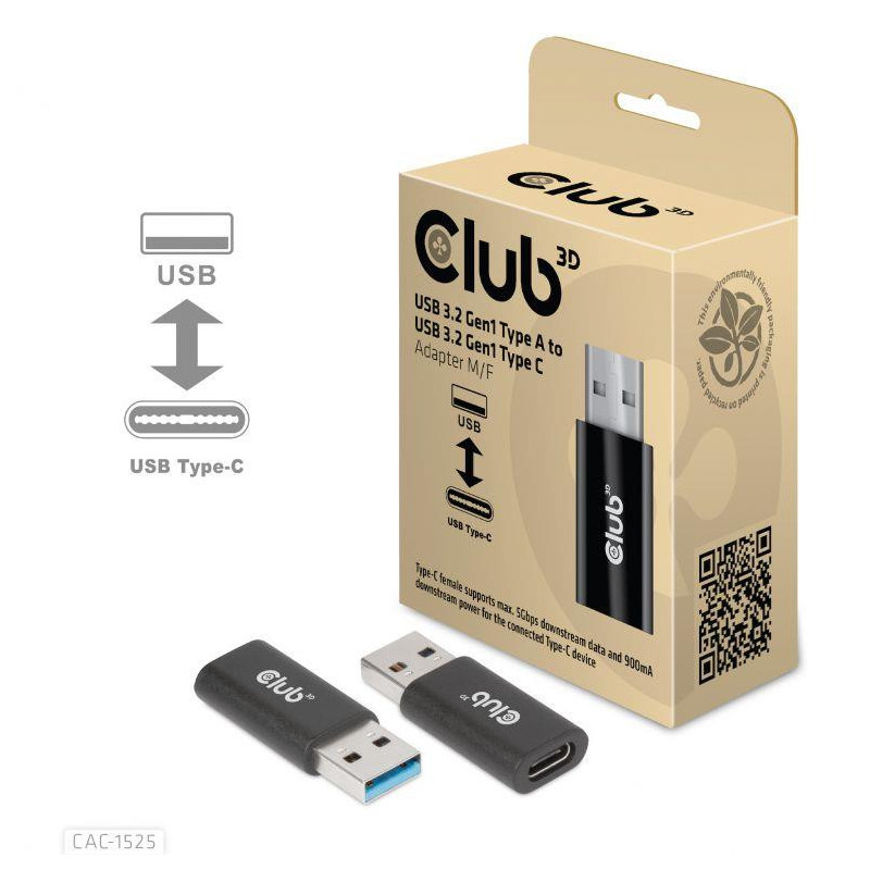USB 3.2 Gen1 Type A to USB 3.2 Gen1 Type C Adapter M/F CAC-1525 The Club 3D USB 3.2 Gen1 Type A to USB 3.2 Gen1 Type C Adapter which allows you to connect your host PC with USB-A port to devices (such as USB disk, mobile phone) with Type-C port for downstream data and power. Besides, you can...