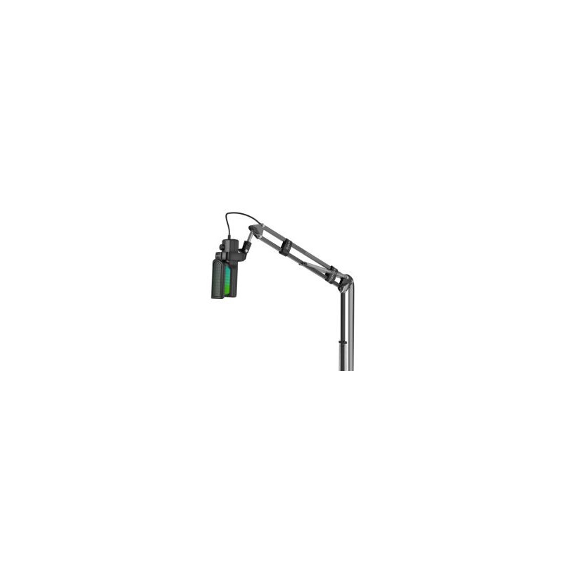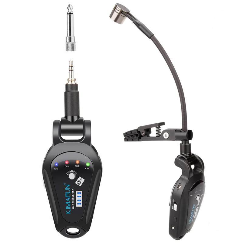 Wireless microphone system for recording sound from wind instruments. It has 2.4 GHz radio transmission with a range of up to 30 meters and includes a condenser microphone with a flexible neck for easy positioning.