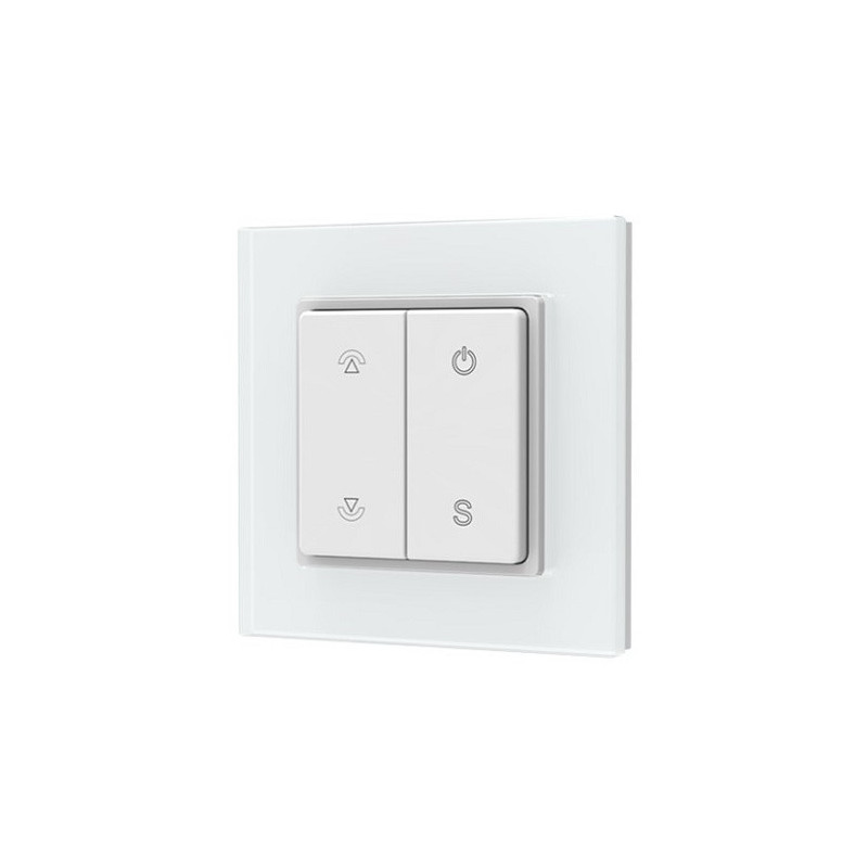 The RF glass panel remote control for single color LED strips operates at 2.4GHz and supports 256 brightness levels. It has 4 buttons, operates up to 30 meters away and is powered by a CR2032 battery.