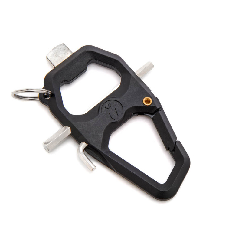 The Toolz Multi-function Carabiner Tool includes a carabiner, three hex tools, a coin wrench, and a bottle opener. This tool is designed for photographers to easily attach equipment and make quick adjustments.