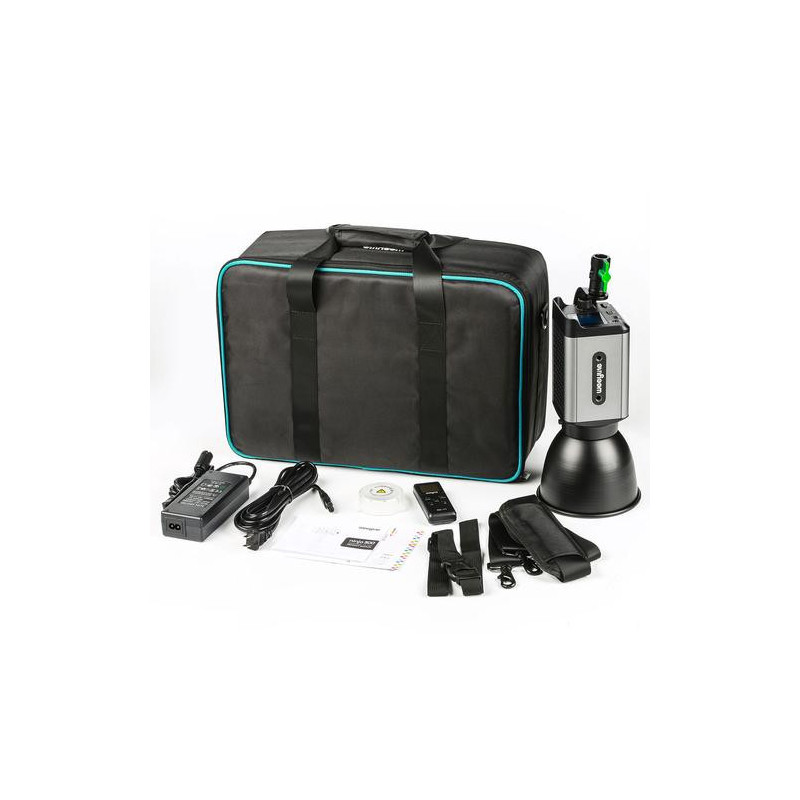 150W LED light source with adjustable color temperature from 2700K to 6500K, powered by NP-F batteries or AC power. The device features Bluetooth control, 12 light effects and is compatible with mini Bowens accessories.