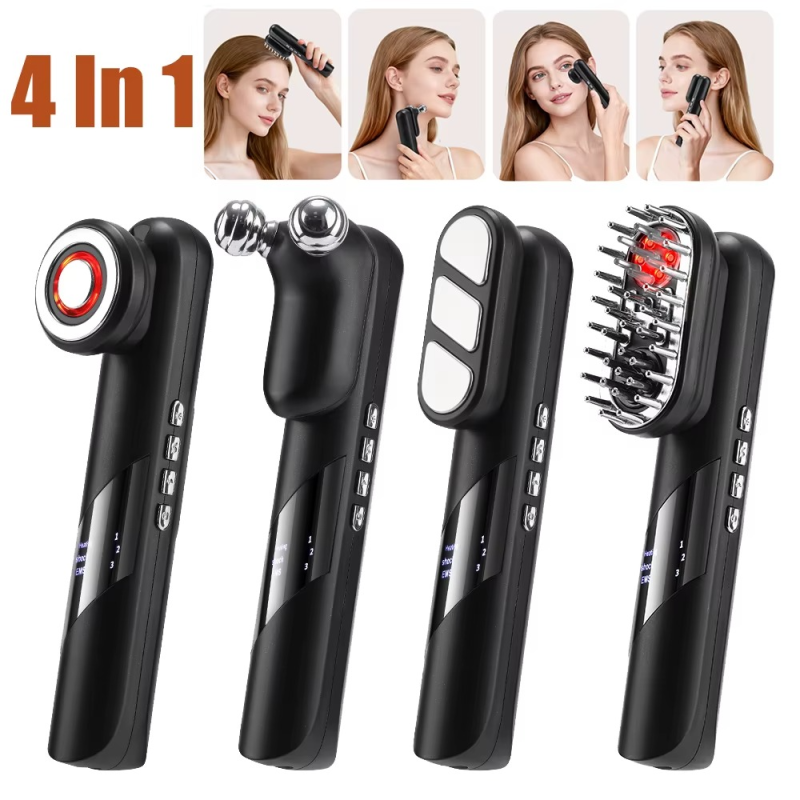 A modern 4-in-1 electric massager for the scalp and face, designed for hair care, stimulating blood circulation, and firming the skin. EMS vibration and heating functions help relax scalp muscles, reduce stress, and promote healthier hair growth.